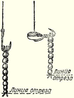 Рис. 7. Стрижка усиков мотыля. Чем сильнее мороз, тем более мелкую мормышку следует применять для ловли. То же самое следует делать на водоемах, часто посещаемых рыболовами. Самые чувствительные кивки применяют для ловли леща. Они обычно значительно длиннее других (до 10 см). Изгибаются под нагрузкой мормышек под углом до 80°. Их распрямление — «подъем» при поклевке должно быть хорошо заметно. Наконец, рыболов-мормышечник должен чаще менять места, искать рыбу. Именно при поисках можно обнаружить стоянки рыбы, особенно, если это лещи. Мормышка, не в пример блесне, привлекает рыбу лишь с небольших расстояний, ее колебания в воде далеко не передаются. Зачастую отход в сторону, на расстояние 6–8 м, позволяет попасть в центр рыбьей стаи или на «рыбью тропу». Однако это происходит обычно в том случае, если вы находитесь вблизи места, облюбованного рыбой. Выбивать близко лунки на местах, ничем друг от друга не отличающихся, бесполезно. Если найдена стоянка рыбы и поклевки наблюдаются чаще на неподвижную мормышку, то лучше заменить снасть и ловить на поплавочные удочки. Светящиеся мормышки (с вкраплениями в верхней части пятен светосостава) привлекают внимание окуней, плотвы, густеры и ерша. Количество поклевок на них заметно возрастает. (Н.Б. Лопатин) | |