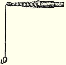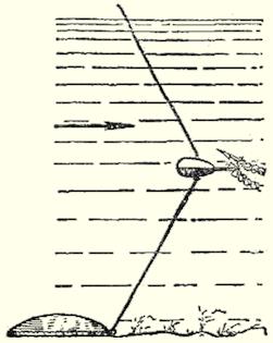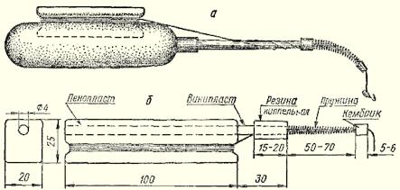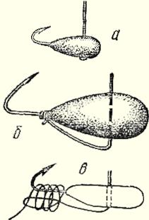 Рис. 6. Дополнительное грузило для ловли на течении. Есть приемы ловли мормышкой с берега рек на течении. Мормышку забрасывают выше против течения и, дождавшись ее погружения, проводят на натянутой лесе (при нагруженном кивке) так, чтобы она не легла на дно, а прошла некоторое расстояние близ него. Для такой ловли лесу отпускают короче длины удилища. На озерах и в малопроточной воде после заброса и погружения мормышки ее тянут, управляя удилищем, к себе или дальше по берегу, по дну водоема или вблизи него — толчками, стараясь передвинуть на возможно меньшее расстояние за толчок. В обоих случаях после нескольких безрезультатных забросов место меняют или медленно и без шума передвигаются вдоль берега, отыскивая рыбьи стоянки. Опытные рыболовы обращают внимание на всякие мелочи. Именно они порой приносят успех. Во время ловли часто, например, появляется необходимость заменить толщину лесы или цвет мормышки, ее размер. Чтобы не заниматься хлопотным переоснащением и не терять на это время, лучше иметь при себе 3–5 удочек, заранее оснащенных примерно так: лесой 0,13 мм и мормышкой для безмотыльной ловли; лесой 0,13 мм и мормышкой с кембриком; лесой 0,10 мм и мелкой мормышкой; лесой 0,15 мм и средней мормышкой. Особое внимание следует обращать на окраску мормышек. Замечено, что зимой часто повышает уловы трехкратное покрытие мормышки бесцветным перламутровым лаком для ногтей. К весне ее окрашивают в зеленый цвет. Для легких мормышек лучше серебристый цвет. На небольших глубинах (до 2 м) лучше маскировать лунку снегом, оставляя небольшое отверстие или щель для прохода мормышки и лесы. При ловле по первому прозрачному льду необходимо выбирать непрозрачные участки или маскировать лед соломой, камышом и т. п. Иногда попадаются «счастливые» лунки, из которых удается поймать всю суточную норму. Такие лунки надо уметь скрытно отметить, чтобы легко отыскать в следующий раз. На самочувствие рыболова часто оказывает влияние тупой крючок мормышки, что не дает возможности засечь рыбу. В такие моменты обычно рыболов сбрасывает впопыхах рукавицы, они падают в воду и намокают, разбивается термос или случаются другие неурядицы. И, конечно, долго отсутствуют поклевки. Готовясь к выезду на рыбалку, необходимо проверять снасти, точить крючки, утеплять термос. Желательно, чтобы в рыболовном ящике для термоса было специальное отделение. Когда нет поклевок, рыболов должен искать новые места, пользоваться другой снастью, проявляя при этом инициативу и настойчивость. При прекращении поклевок в добычливой лунке следует использовать такой прием: опустить в нее мормышку другого цвета или другой формы. Если поклевки возобновятся — значит, надо чередовать ловлю разными мормышками. Этот прием помогает и при поимке одного-двух окуней из стаи, которая окружает мормышку, но не берет. Стоит сменить мормышку и последует поклевка. Но если снова клев прекратился, нужно затемнить лунку снегом и дать ей «отдохнуть» 25–30 мин. Клев может возобновиться. Кстати сказать, всегда предпочтение дается поочередной ловле в нескольких лунках со сменой их при малейшем ослаблении клева и возвращении к ним после их «отдыха». Избегая применять мормышки, снабженные многими блестящими гранями, некоторые рыболовы делают «зеркальце» — спиливают верх шаровой и каплеобразной мормышки, затем «з