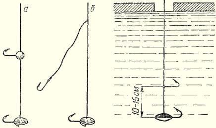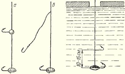 Рис. 4. Способы привязывания мормышек: а — узлом; б — за крючок; в — схема завязывания за крючок. Существует два способа привязывания мормышек к лесе: за цевье крючка или только через отверстие. Привязывание через отверстие с вязкой удерживающего узла на лесе более замаскирует мормышку, особенно при наличии зенковки нижнего края отверстия. Однако привязка лесы за цевье крючка с пропуском лесы через отверстие мормышки надежнее. А если под сгиб лесы заложен мотыль, то такая привязка не только прочнее, но и привлекательнее — мотыль остается живым и шевелится. Многие рыболовы не ловят слишком большими мормышками, а применяют для ловли на глубинах свыше 4 м две мормышки, помещенные на одной лесе, до 20 см одна от другой. Такая разница в расстоянии между мормышками необходима при ловле разных рыб. Осторожные рыбы предпочитают мормышки, расставленные на 15–20 см. Это лещ и язь. Для окуня и плотвы достаточно 7–8 см. Когда удочка оснащается двумя мормышками, это даст рыболову ряд преимуществ: можно ловить на глубинах и умеренном течении; мормышки быстрее опускаются на заданную глубину; снасть становится чувствительнее, можно использовать более толстую лесу; верхняя мормышка может быть мелкой или легкой (пластмассовой); можно использовать мормышки разных цветов и форм (рис. 5). Рис. 5. Две мормышки на лесе и снасть с дополнительным крючком: а — две мормышки; б — дополнительный крючок. Более крупная и планирующая мормышка помещается внизу, а мелкая, шаровая или каплевидная, привязывается на лесу первой. Нижняя мормышка не должна быть светлее верхней. Наоборот, лучше подобрать ее темнее по цвету. Например, для ловли леща на глубинах более 4 м оказалась лучшей комбинация из двух мормышек: нижней — крупной или средней дробинки с латунным верхом и верхней — средней или мелкой оловянной дробинки или мормышки из красной пластмассы. Мормышки из красной и оранжевой пластмассы в солнечные дни хорошо привлекают рыбу, но без нижней грузовой мормышки их применение невозможно. Рыболов, выбрав место ловли, готовит лунки. Место для ловли на мормышку, особенно на глубинах более 2,5 м, готовится очень тщательно. Всю ледяную крошку и снег убирают вокруг лунок и помещают их за спину. Для защиты лесы и кивка от порывов ветра рыболов всегда располагается к нему спиной. Если не расчистить место от крошек льда в снега, то леса будет за них цепляться, что мешает ловле. Очень важно также, чтобы под тяжестью мормышки леса в воде вытягивалась в прямую линию без перегибов или спирали. Для выпрямления лесы можно ее натянуть и выдержать в растянутом состоянии 5–10 с. Отпуск лесы для ловли должен обеспечивать расположение кончика удильника в 20–30 см от поверхности льда, а при сильном ветре еще ниже. Для активной игры мормышкой удильник лучше держать двумя руками. Правая рука обхватывает удильник и опирается на бедро чуть выше колена, а левая обхватывает кисть правой и может быть на весу с локтем, прижатым к боку. Кисти рук должны быть расслаблены во время игры и напрягаться во время подсечки. Подсечка при ловле на мормышку производится при любом движении или изменении положения кивка и только коротким движением кисти руки. Широкий взмах предплечьем и тем более плечом приведет к обрыву лесы. За подсечкой сразу следует плавный подъем удилища с контролем за силой сопротивления ры