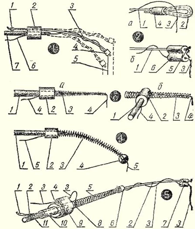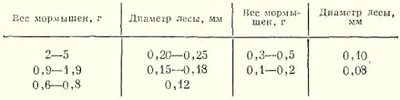 Рис. 3. Кивок М. Слепухина. Шаровые мормышки не имеют игры. Лишь при движении удилищем вверх и вниз происходит слабое покачивание головной части мормышки. Шаровые мормышки привлекают рыбу, особенно при шевелении на дне. Каплевидные мормышки несколько лучше покачиваются при движении удильника, применяются для безмотыльной ловли при наклонной подвеске. Привлекают рыбу и при шевелении на дне. Плоскоовальные мормышки отличаются игрой, планируют в сторону при движениях удильником. Игра ими состоит из медленных и плавных покачиваний. Граненые мормышки имеют особый отблеск, часто привлекающий рыбу во тьме глубин и в условиях плохой освещенности. Мормышки конические и каплевидные глубже захватывает рыба, что улучшает их засечку. Полностью проявляются качества мормышек в том случае, если их вес соответствует толщине лески. В. Портнов предлагает использовать следующие расчеты (табл. 1). Рыболовы стремятся приобрести импортные нейлоновые и силоновые лесы, имея в виду их прочность, большую прозрачность. Самые лучшие лесы они ставят именно на мормышки (рис. 4).