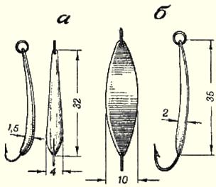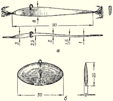 Рис. 10. Блесны: а — «поперечная» («экспериментальная»); б — «ракушка» Тяжёлая блесна московского рыболова Ф. Я. Серикова (рис. 11), предназначенная для ловли на больших глубинах с течением, изготовляется трех размеров: большая — для ловли судаков и щук; средняя — для ловли судаков и окуней; малая — для ловли окуней. Материал — круглая медная болванка. Распилив её вдоль на две части, отрезают заготовки по длине будущей блесны; опиливая, придают нужную форму и слегка изгибают. Затем сверлят отверстия, отделывают блесну начисто, защищают до блеска, серебрят и оснащают. Окунь и щука хорошо берут на неё и несеребренную, но только на отшлифованную.