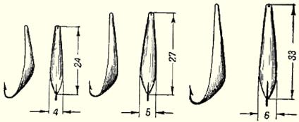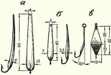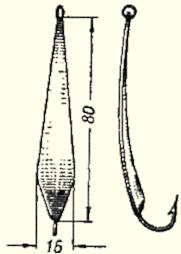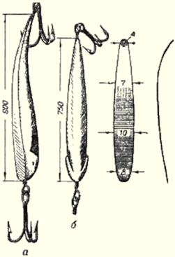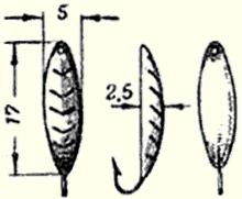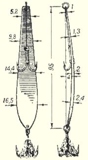 Рис. 9. Блесна промкомбината «Рыболов-спортсмен» «Поперечная» блесна (рис. 10, а). изготовляется из белого металла, меди или латуни в форме удлинённой пластинки с утолщением к более широкой стороне. Медная или латунная — серебрятся. В узком конце пластинки впаяны два одинарных крючка № 16, в более широком — один крючок того же размера. У края, по центру тяжести при продольном положении пластинки, просверлено отверстие, в которое пропущено колечко для прикрепления блесны к лесе. Каждый крючок замаскирован красным шерстяным пушком. При погружении в воду блесна идёт утолщённым концом вниз, при остановке занимает горизонтальное положение, качаясь наподобие коромысла. Нижняя свободная часть её делается несколько тоньше верхней. Блесна «ракушка» (рис. 10, б) изготовляется из тех же материалов; это эллипсовидная, выпуклая с двух сторон, пластинка белого, жёлтого, красного цвета или в их различном сочетании (одна сторона — белая, другая — жёлтая и т. п.). В центре пластинки, у одного из краёв,просверлено отверстие, в которое пропущено колечко для прикрепления к лесе. К этому же колечку привязан поводок из тонкой проволоки с замаскированным двойником, который не выходит за плоскость блесны.
