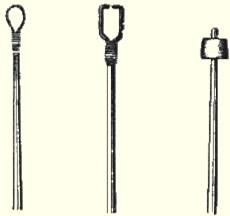 Рис. 16. Соединения блесны с леской Для ловли щук применяются наиболее крупные и широкие из описанных блесен. Голавль и язь ловятся редко и, как правило, на блесны жёлтого и красного цветов, среднего и малого размеров. В конце декабря и начале января, чаще всего перед нерестом, одновременно с судаком, щукой и окунем изредка ловится на блесну налим (лучше в ночные часы). Удилище для ловли на блесну должно быть прочным (способным выдержать груз 3-5 кг), удобным, лёгким и вмещать запас лески, достаточный для больших глубин. Для окуневого удилища достаточна грузоподъёмность 1 кг. Угол линии прогиба удилища должен равномерно увеличиваться к тонкому концу в пределах примерно до 40-45° по отношению к основанию. Такой строй удилища создаёт жёсткость, необходимую при подсечке крупной рыбы. Удобным и лёгким является удилище с утолщённой комлевой частью в виде ручки из пробки, дерева или куги, цельное или составное (из двух частей), изготовленное из лёгких прочных и гибких сортов древесины. Для комлевой части складных удилищ с успехом могут быть использованы дюралюминиевые тонкостенные трубки или бамбук с удалёнными внутренними перегородками. Это позволит при складывании удилищ прятать в них верхние тонкие концы, которые изготовляются из цельного бамбука, можжевельника или пластмассы. Пропустить леску через вершину удилища можно с помощью небольшой петли или кольца из медной или латунной миллиметровой проволоки, рамочки из той же проволоки с пропилом шириной до 0.6 мм. Можно закрепить лесу, зажав её небольшим пробковым резиновым кольцом (рис.17).