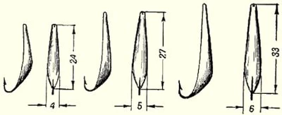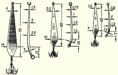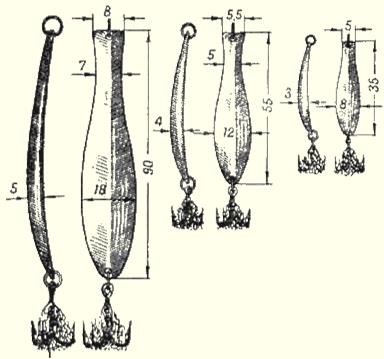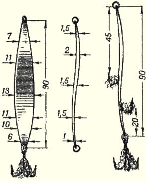Рис. 8. Блесны С. М. Преображенского с добавлением двух одинарных кованых крючков. Один из них припаивается в 20, другой в 45 мм от нижнего конца. Крючки располагаются в разные стороны от плоскости блесны и маскируются каждый небольшим красным шерстяным пушком. Блесна хороша даже в таких случаях, когда судак хватает её поперёк. Блесна промкомбината Московского добровольного общества «Рыболов-спортсмен» (рис. 9) изготовляется из медной, латунной пластинки и оловянного или свинцового припоя. Выпуклая сторона — светлая, внутренняя — вогнутая — заливается оловом или свинцом с утолщением слоя к тройнику. Оснащается по типу предыдущих блесен.