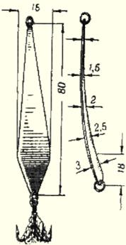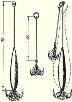 Рис. 14. Блесна В. М. Васильева Необходимо отметить, что никелированные блесны менее привлекательны для рыбы, чем медные, латунные и посеребрённые. Некоторые рыболовы-зимники с успехом заменяют блесну «снасточкой», на которой укреплена мёртвая рыбка (рис. 15). Изготовляется она из отрезка медной или латунной проволоки диаметром 1-1,5 мм. Длина проволоки 8-10 см. Один конец расплющивается и в нём просверливается отверстие для заводного кольца. В другом конце закрепляются два крупных крючка (№ 10), направленных в разные стороны, крючки заливаются свинцом. Одинарные крючки можно заменить свободно висящим на кольце тройником. К отрезку тонкой стальной проволоки длиной 45 мм подвешивается небольшой тройник, а с другой — заводное кольцо. Через рот мёртвой рыбки вводится острым концом вперёд изготовленная снасточка и пропускается через все её тельце. Конец должен выйти около хвоста, а крючки придвинуться к голове. Лёгким нажимом пальцев рыбке придаётся небольшой изгиб. Затем с помощью заводного кольца проволока с тройником соединяется с концом стержня снасточки у хвоста, тройник одним из крючков закрепляется в спине рыбки, леса присоединяется к заводному кольцу. Каждый крючок и тройник маскируются пушком.