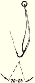 Не менее активным и интересным видом зимней рыбалки является старинный русский способ ловли рыбы на блесну, или «блеснение», получивший в последние годы очень широкое применение. На блесну ловят окуня, судака, щуку и других хищников пресноводных водоёмов. Простое устройство снасти, несложная техника ловли могут быть быстро освоены каждым рыболовом. Основа ужения рыбы на блесну — использование металлической пластинки (блесны), движения которой в воде — «игра» — имеют некоторое сходство с движением малька или небольшой рыбки. Движения блесны в воде действуют как возбудитель инстинкта хищной рыбы. Задача рыболова — сделать блесну такой, чтобы она формой и цветом привлекала рыбу. Блесны изготовляют из медных или латунных пластинок, утяжеляя их оловом или свинцом. Разнообразие «игры» зависит от формы блесен и смещения в них центра тяжести. Мелкие и лёгкие блесны предназначаются для ловли окуней, крупные и тяжёлые — для ловли судака и щуки. Кроме того, они отличаются друг от друга формой, цветом и оснасткой. Все сказанное ранее о выборе мормышки можно целиком отнести и к выбору блесны. Бесспорное значение имеет цвет блесны, его оттенки (из меди — красные, из латуни — жёлтые, из свинца — тёмные, из белого металла или посеребрённые — светлые). В отдельных водоёмах цвет блесны имеет почти решающее значение. Видимо, тот или иной оттенок блесны лучше воспринимается хищником как привычный и, следовательно, не вызывающий подозрений. Отмечены случаи, когда улучшение клёва достигалось тем, что в разное время дня применялись блесны различных цветов: утром рыба брала на тёмную блесну, к вечеру — на светлую. Очень интересны результаты применения блесен различных цветов при ловле на больших глубинах. Более уловисты светлые сверкающие блесны, но в яркие солнечные дни рыба берет и на тёмные, свинцовые. Обычно блесну прикрепляют к лесе на небольшом колечке из тонкой медной или латунной проволочки, продетой в отверстие на конце блесны. В таком случае необходимо тщательно проверить прочность соединений (пайки) концов проволочки на самом колечке и соединить их не в стык, а внакладку. Крючок закрепляется так, чтобы его жало отходило в сторону от основания блесны под углом 20-25° (рис. 1).