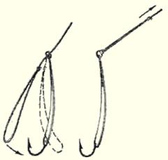 Рис. 15. «Снасточка» Существенное значение имеет способ соединения блесны с жилковой лесой. Правильный способ — подвешивание блесны на петельку. На конце лесы делается петля по длине блесны, петля пропускается в колечко и надевается на блесну, после чего затягивается (рис. 16). Такой способ упрощает и замену одной блесны другой.